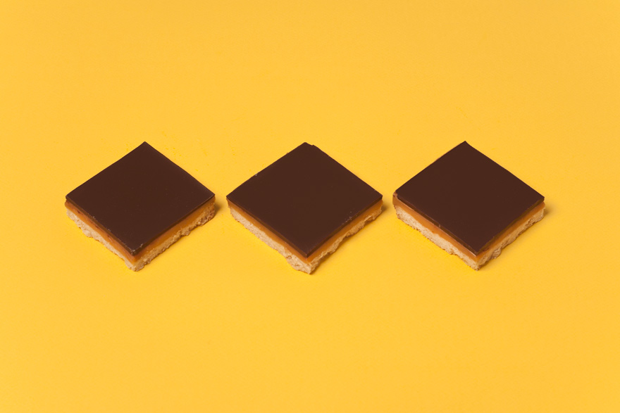 - Don't use a spatula to spread out the caramel and chocolate layer, this will only result in an uneven surface. Instead, just pour them down in the middle of the tin, then tip it to each side - perfectly even layers every time.